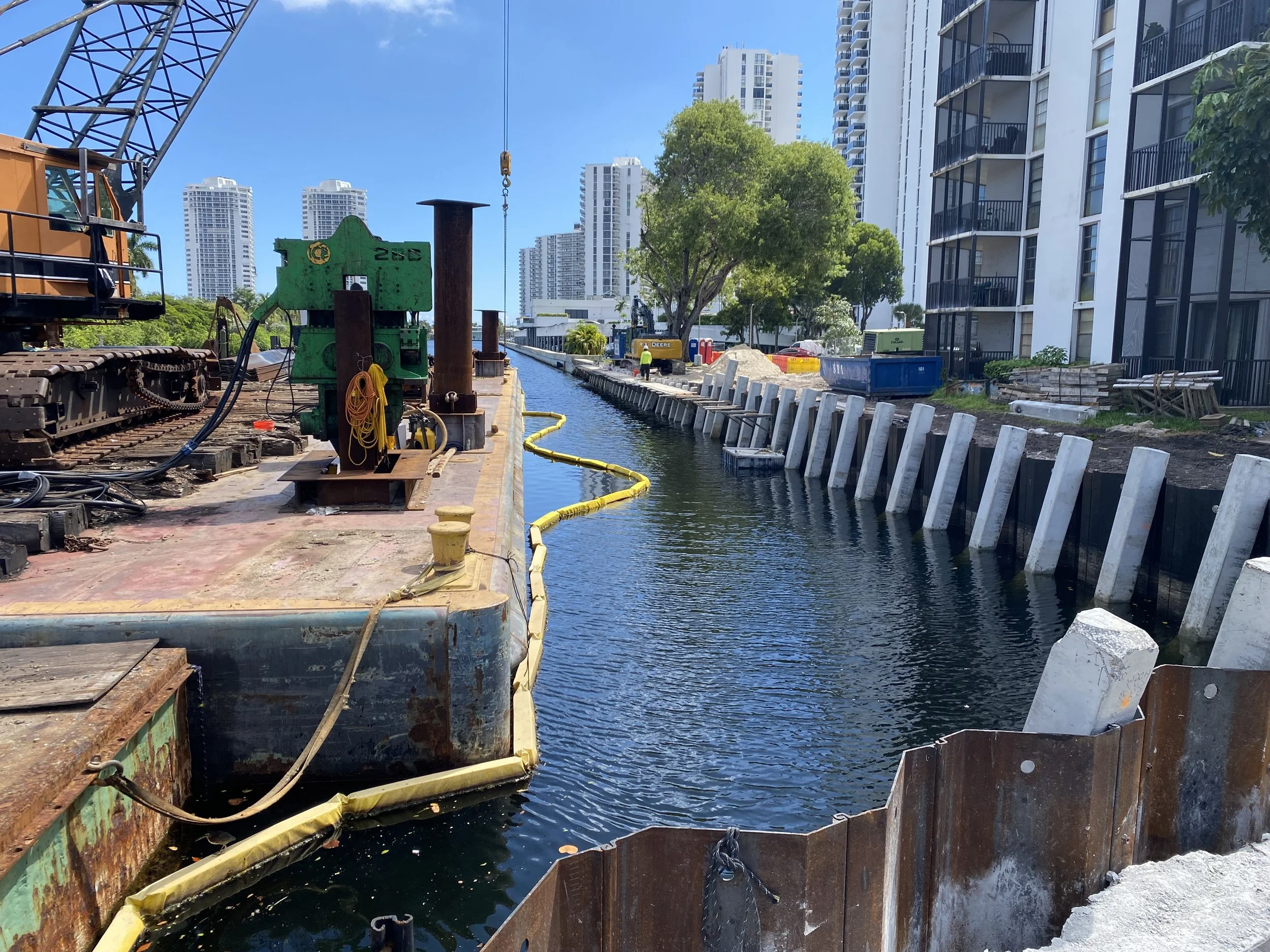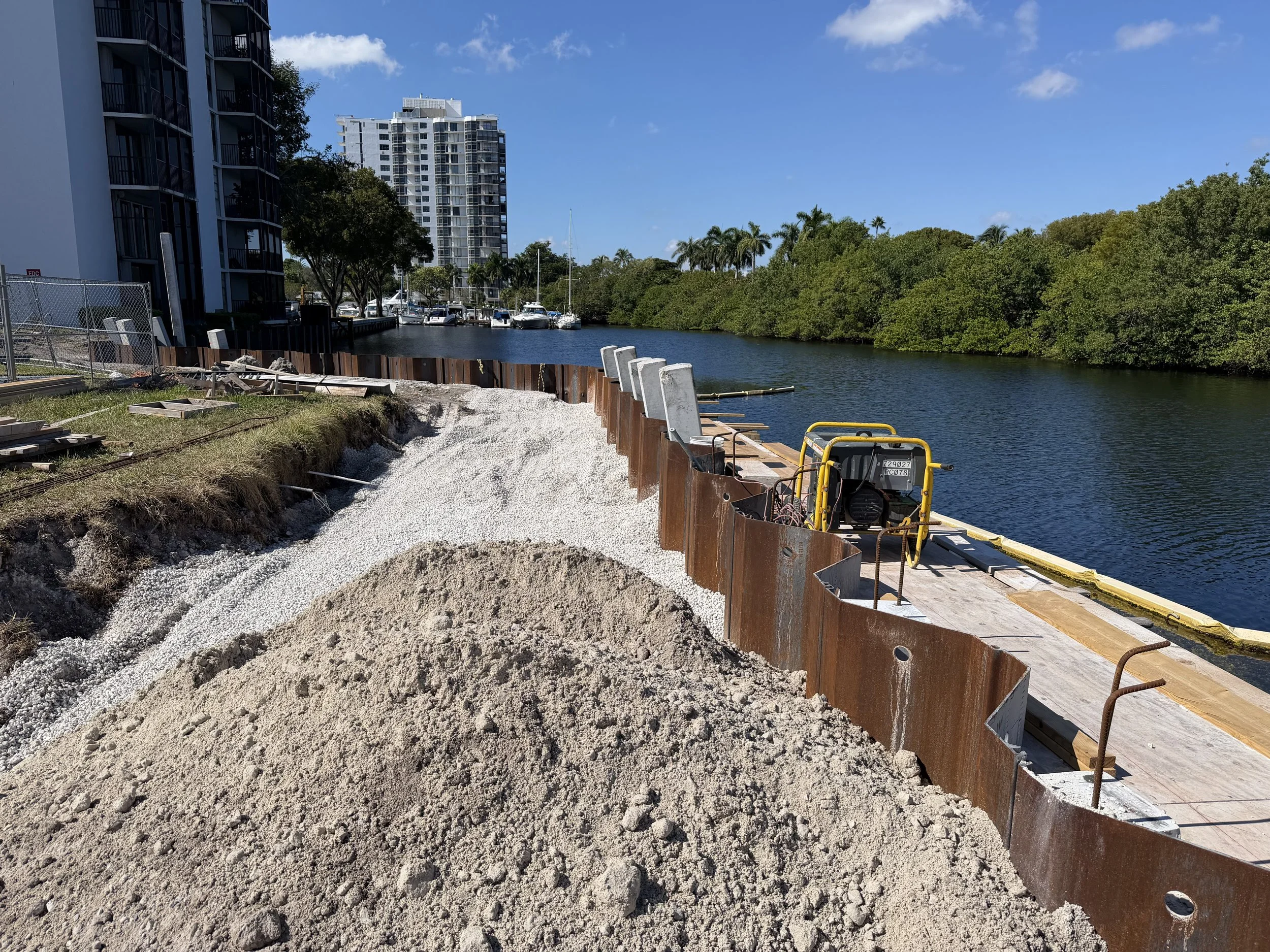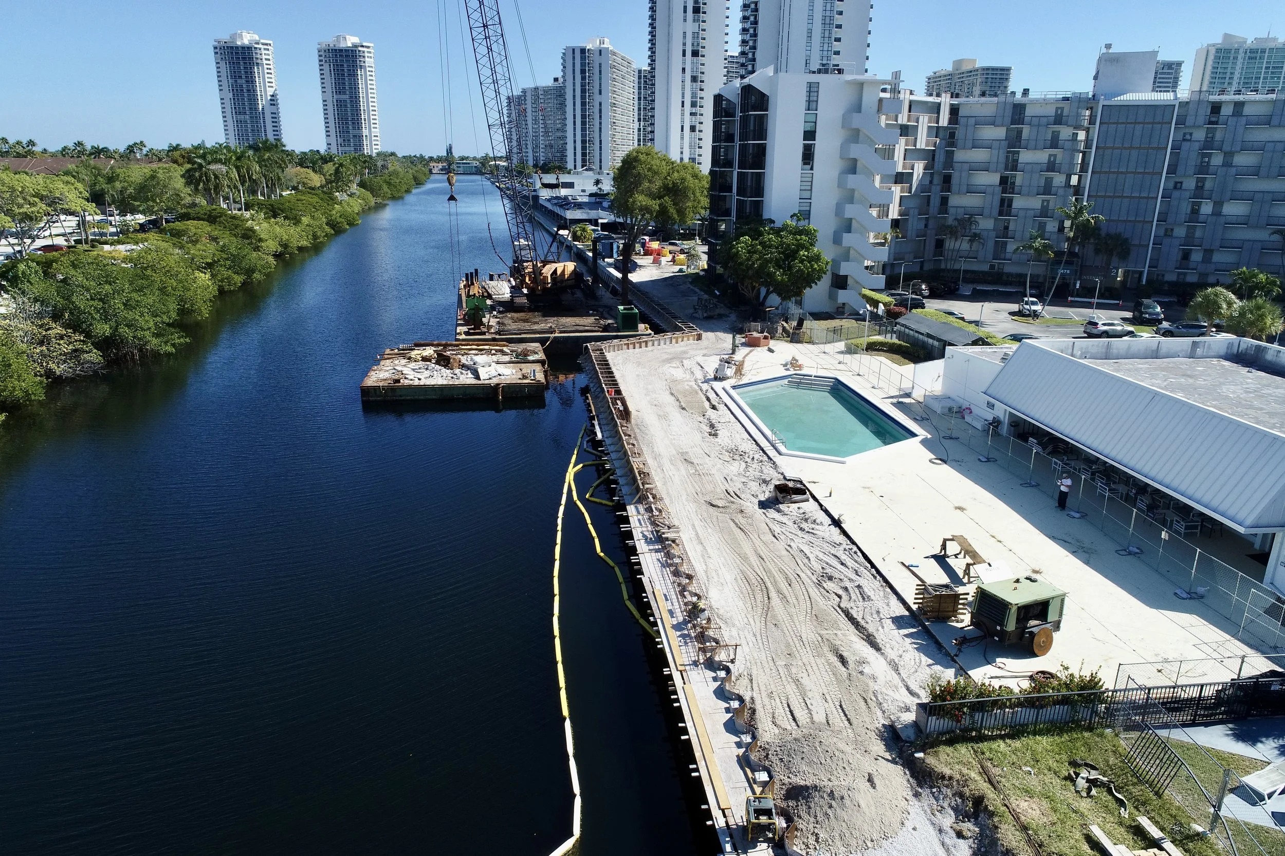 This project will consist of constructing a new 1,020-linear-foot steel sheet pile seawall, including the supply and installation of 500 linear feet of floating turbidity curtain and the demolition and disposal of existing deteriorated wall sections. The scope also includes furnishing and installing 38-foot-long concrete batter piles and placing limestone riprap boulders at the toe of the new seawall. We are confident that this newly constructed wall will provide lasting protection and peace of mind to the surrounding community.