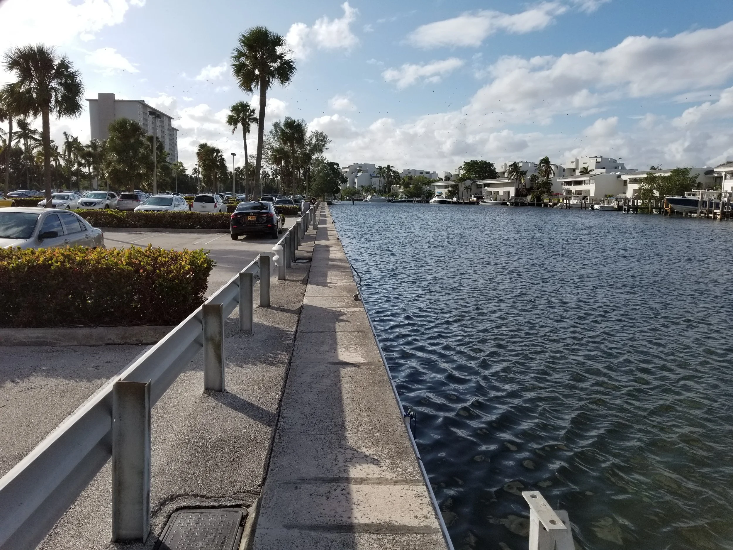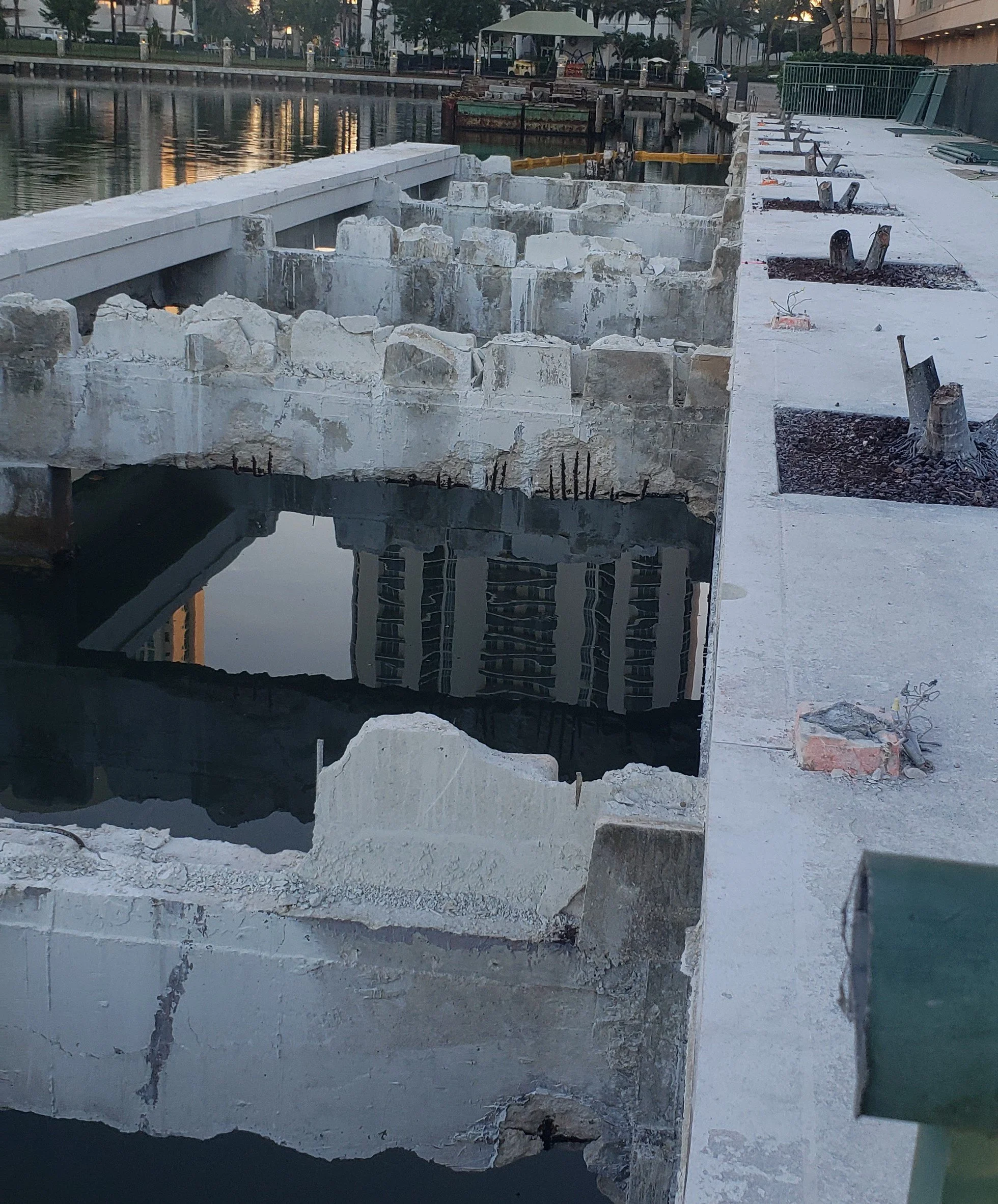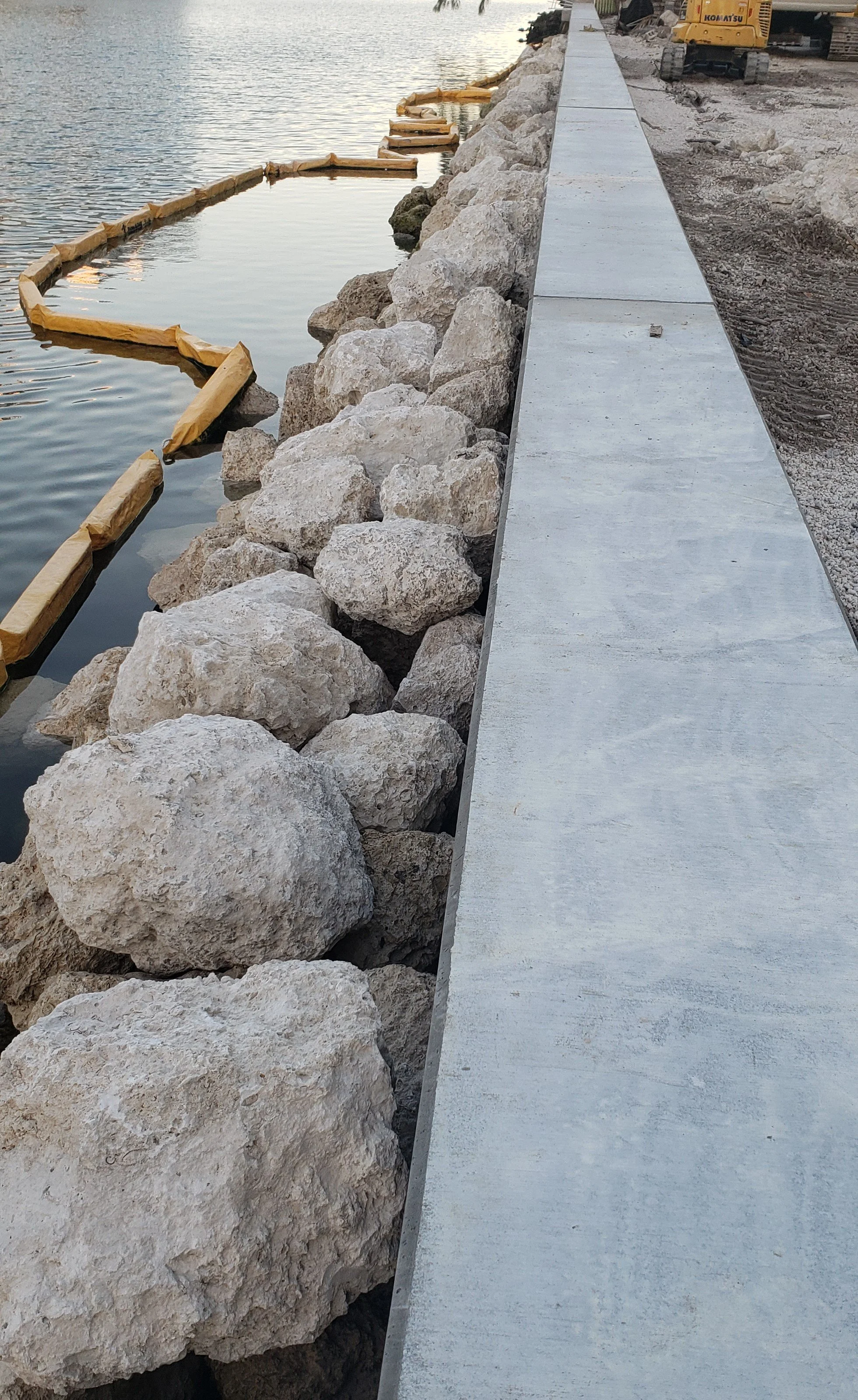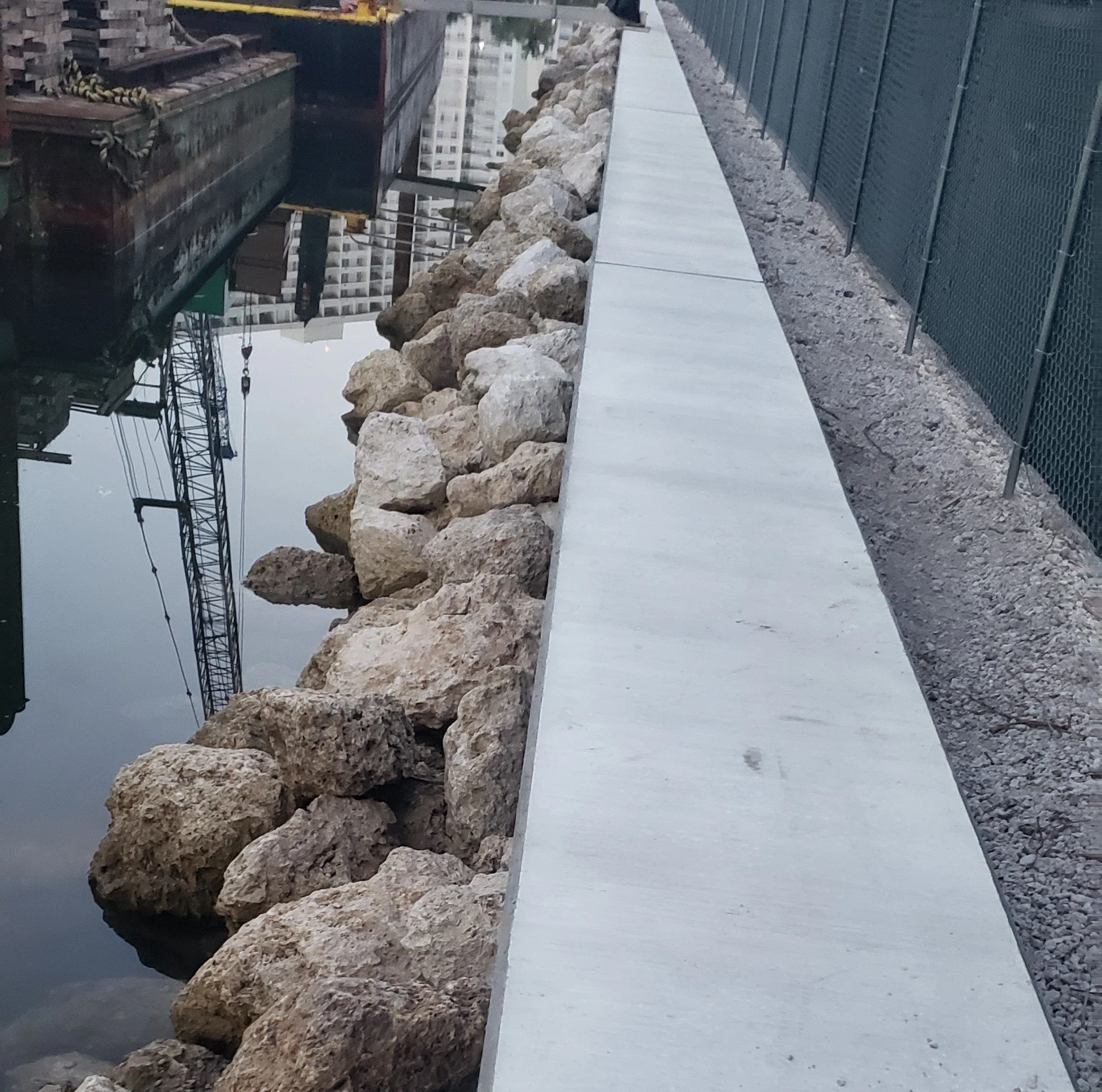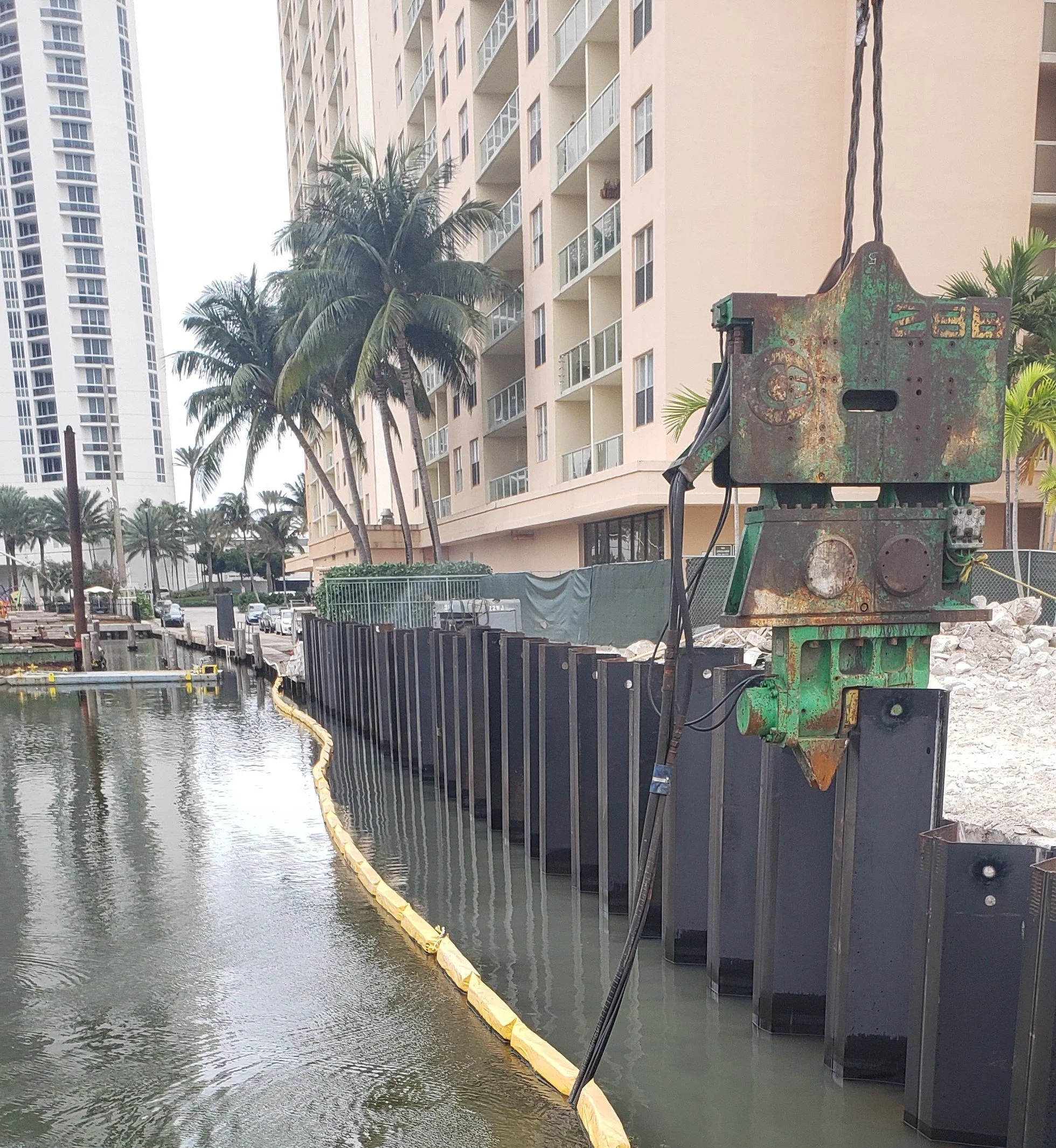 Shoreline Foundation, Inc. (SFI) was contracted by Plaza Construction for the Las Marinas Project in Sunny Isles Beach, Florida, to provide demolition and installation services. The project involved the demolition of the old seawall and overhanging pool deck, followed by the installation of pre-stressed concrete piles, steel sheet piling, and concrete caps. Divided into three segments—north, south, and northeast—the north and south seawalls were completed approximately 30 days ahead of schedule, while the northeast segment remains in environmental permitting. The north seawall included the demolition of 718 linear feet of seawall cap and 10,000 square feet of concrete pool deck overhang, followed by the installation of 718 linear feet of steel sheet pile driven to a depth of -26 feet, a 2'6" x 1'6" concrete cap, and 718 cubic yards of boulder riprap. The south seawall involved similar work, with 457 linear feet of steel sheet pile, a new concrete cap, and 457 cubic yards of riprap along the water side.