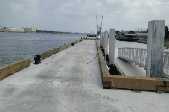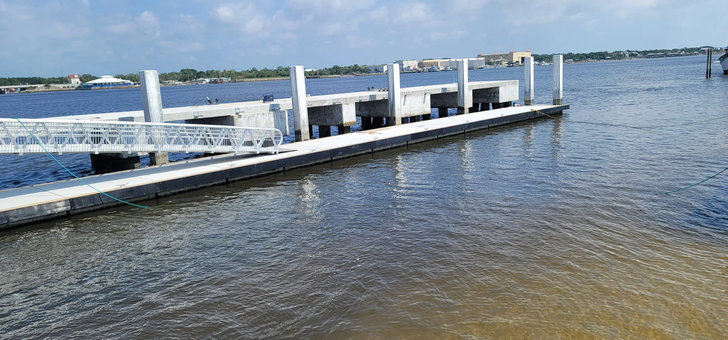 This project involved the construction of an L-shaped concrete dock and a concrete floating dock, both supported by substantial concrete piles. The primary dock spans approximately 42 feet by 100 feet, with an additional L-shaped branch measuring 17 feet by 150 feet, all supported by 78 concrete piles. The floating dock measures 15 feet by 145 feet, anchored by eight 24-inch concrete piles. Utilities, including 480v electrical, water supply, and a sewer pump-out system, were integrated into the dock infrastructure.