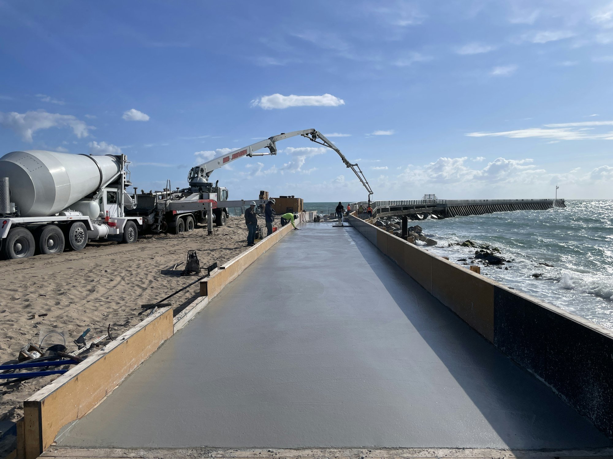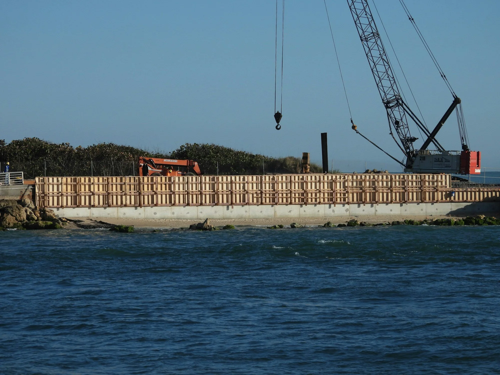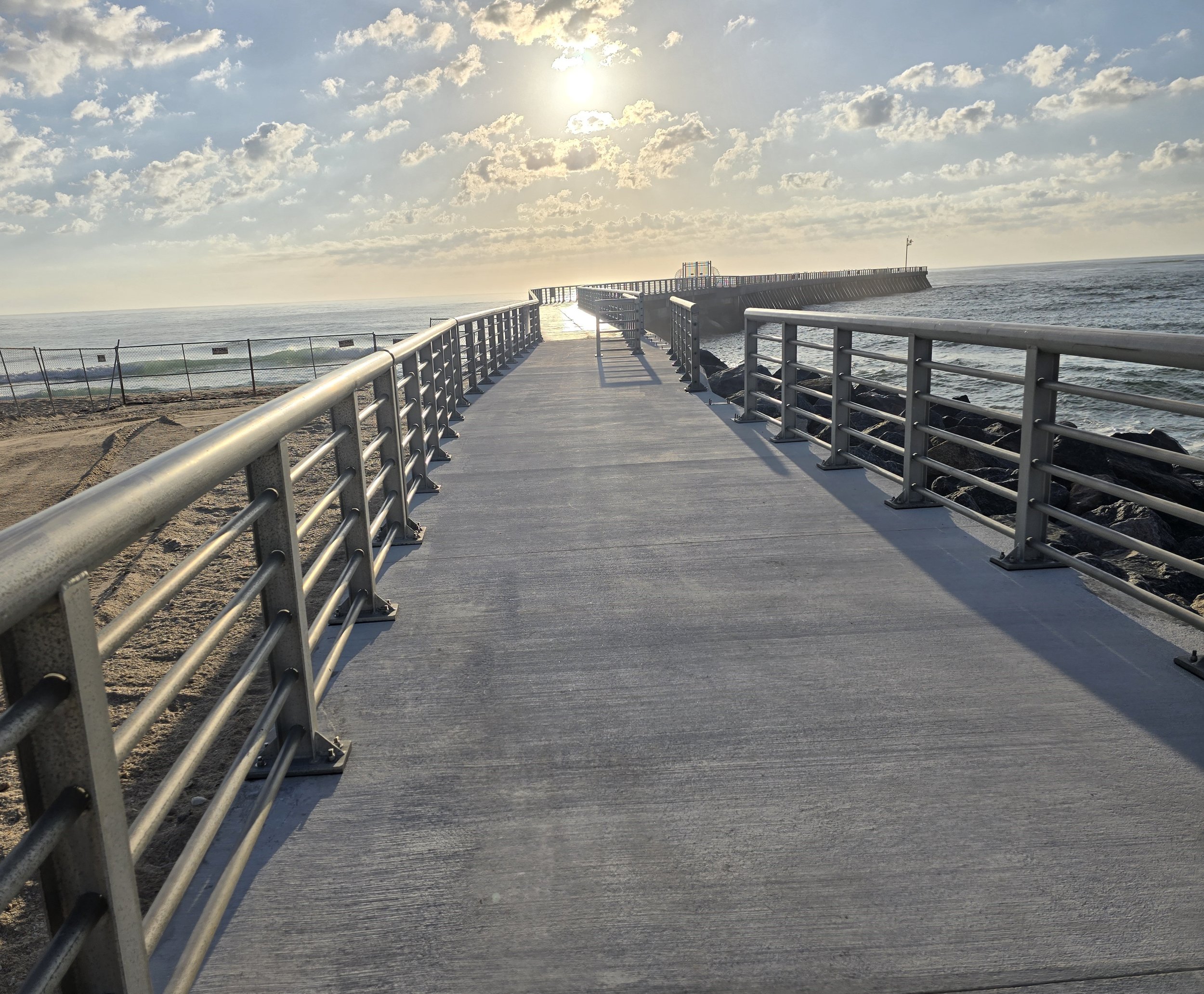 After storm damage compromised the North Jetty revetment wall, Shoreline Foundation, Inc. stepped in to restore and reinforce the area. The project included removal of the existing walkway, concrete revetment, and armor stone, followed by installation of 400 LF of steel sheet pile in an oval layout. A 10-foot concrete skirt wall was constructed, along with 840 SY of marine mattress filled with 450 tons of bedding stone, extending 30 feet into the water. SFI then placed 1,650 tons of 48" armor stone for shoreline protection. A new sidewalk with handrails was added, reconnecting to the north pier, and the project was completed with sand dune restoration and native beach plantings.