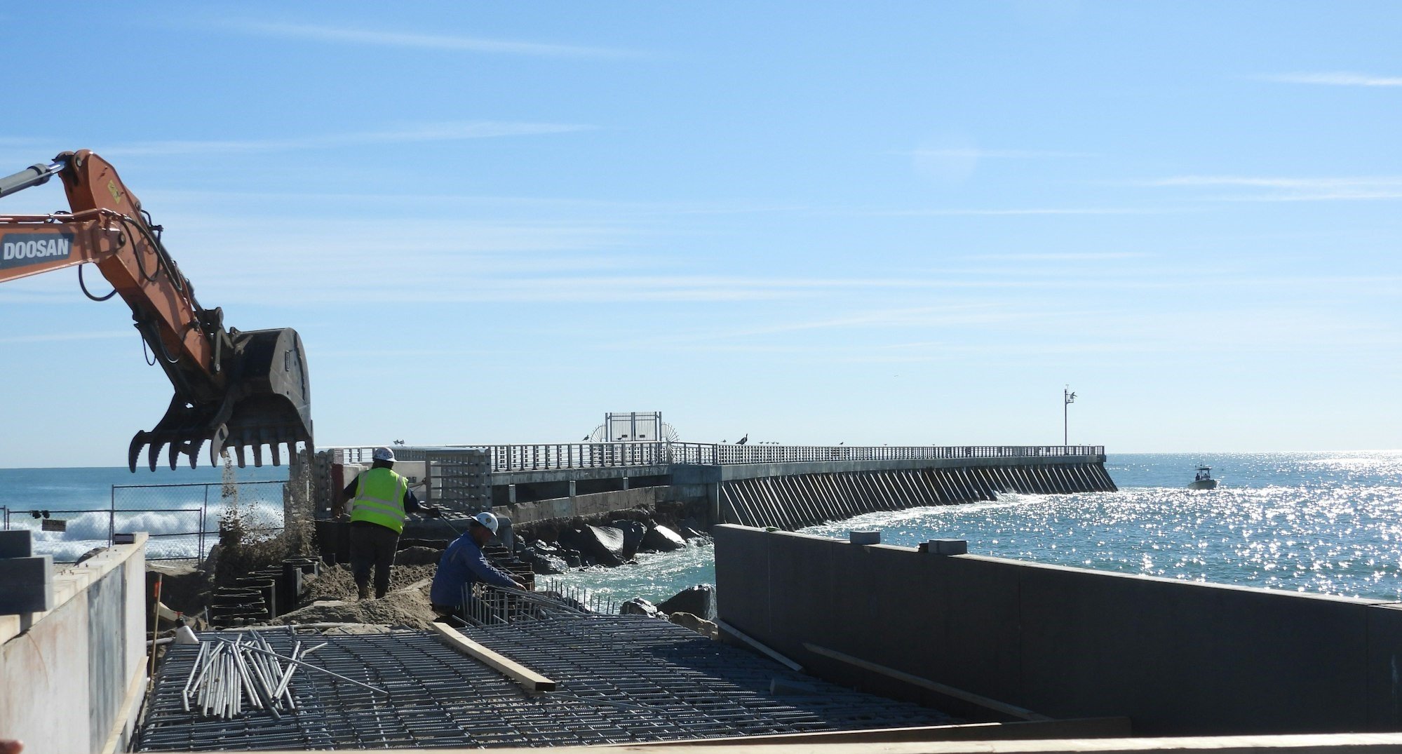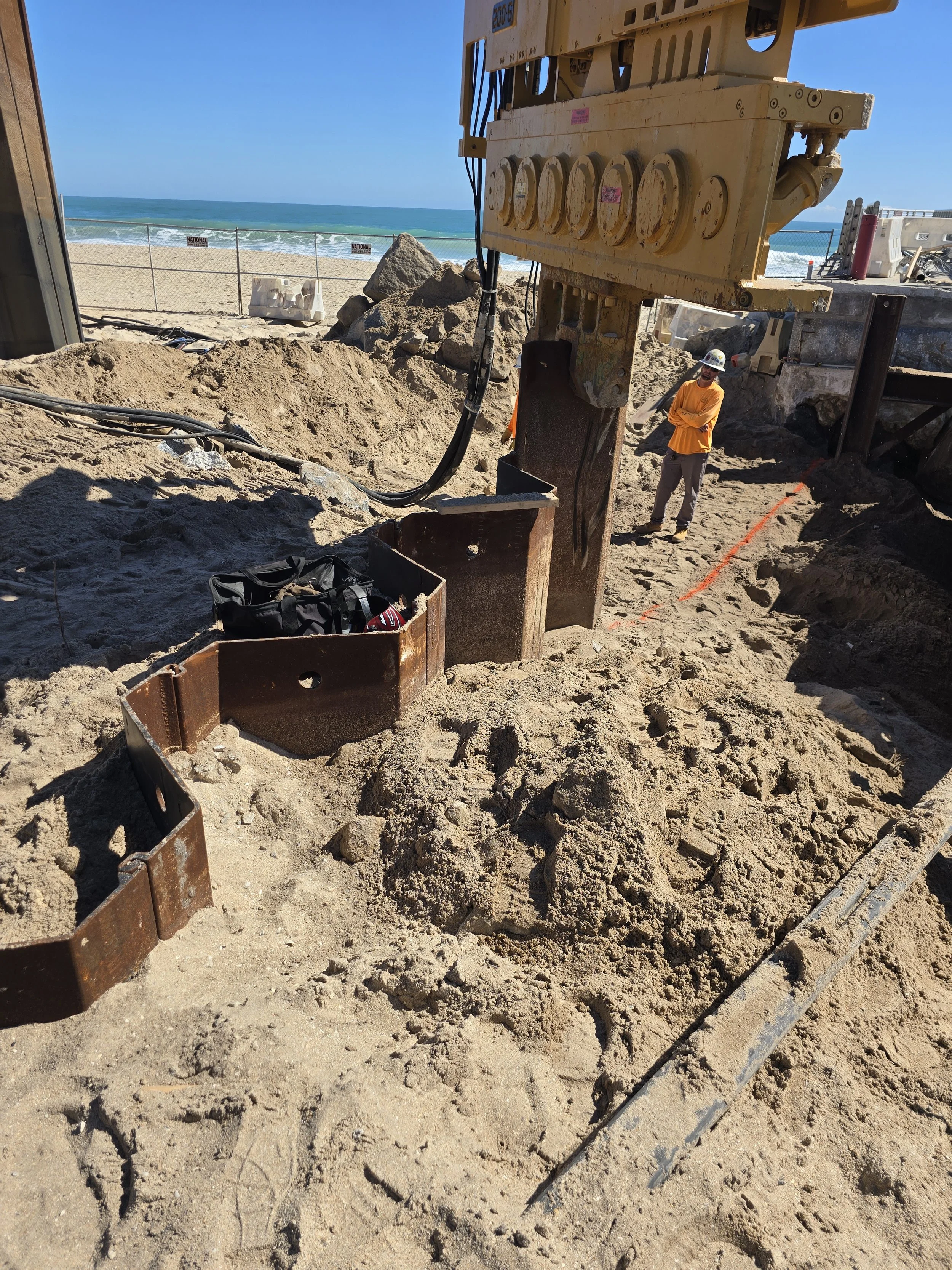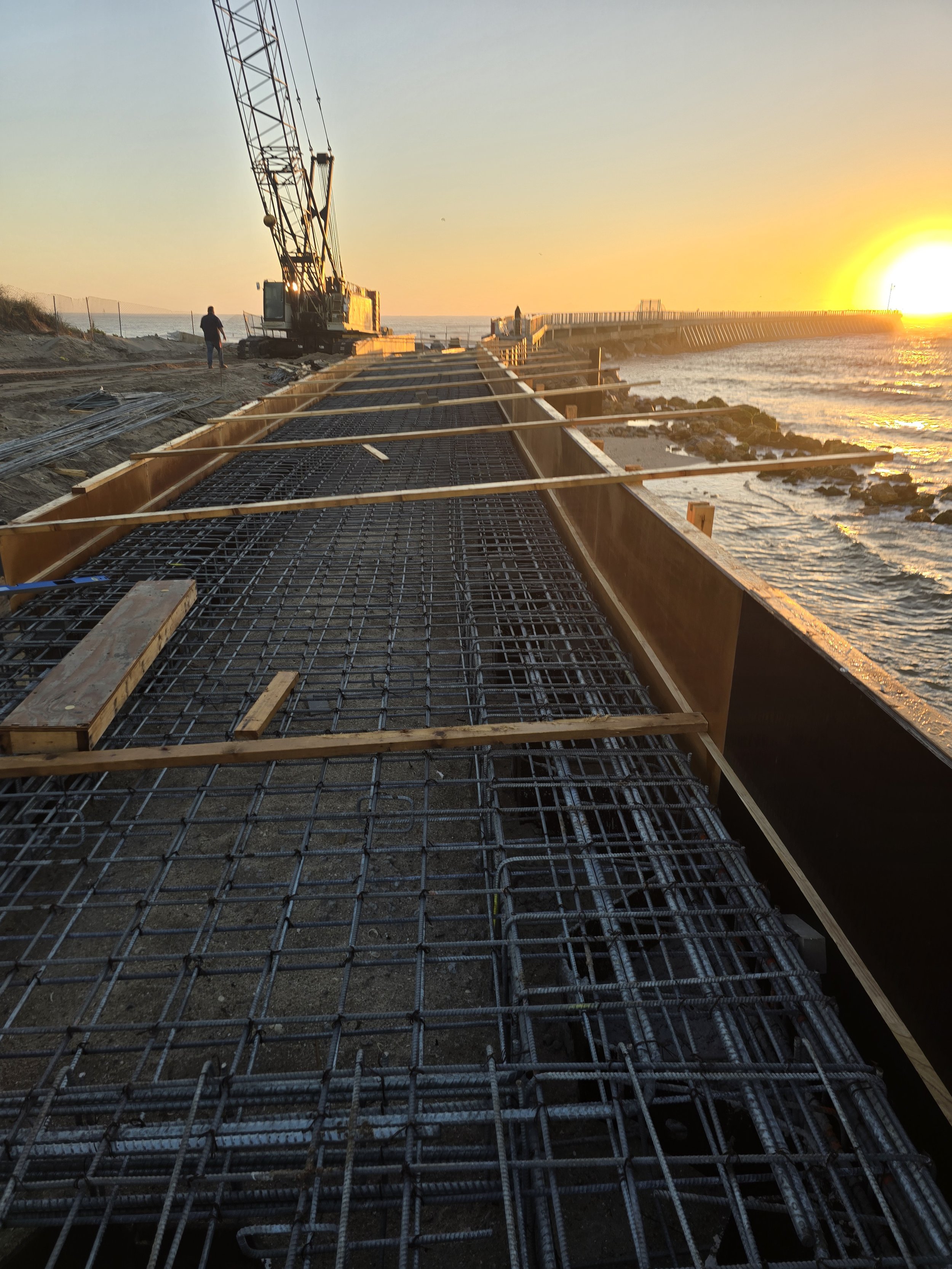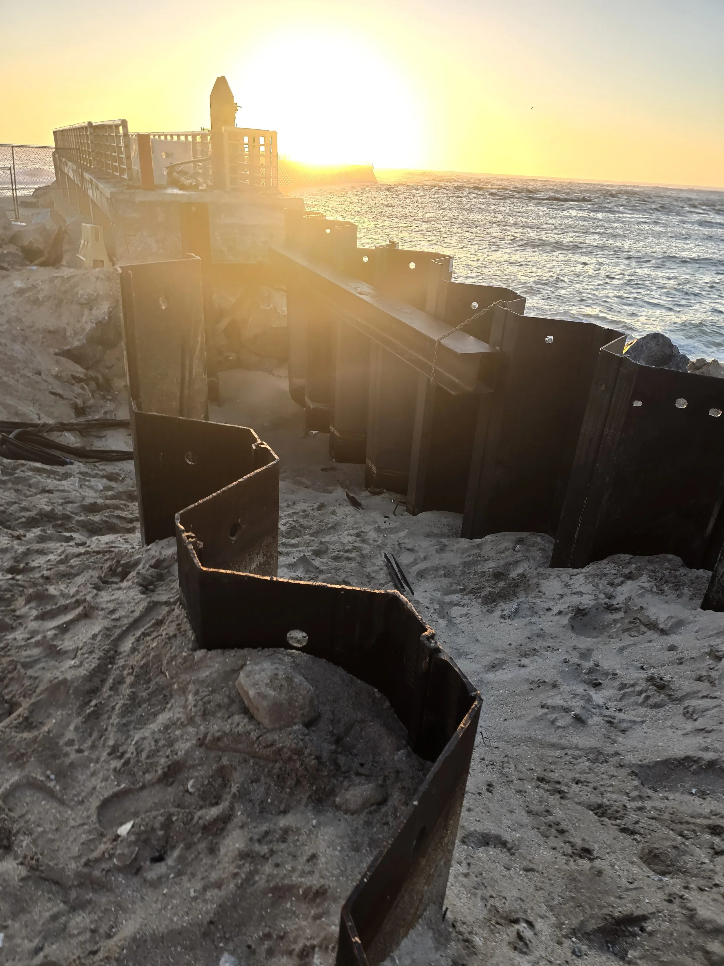 After storm damage compromised the North Jetty revetment wall, Shoreline Foundation, Inc. stepped in to restore and reinforce the area. The project included removal of the existing walkway, concrete revetment, and armor stone, followed by installation of 400 LF of steel sheet pile in an oval layout. A 10-foot concrete skirt wall was constructed, along with 840 SY of marine mattress filled with 450 tons of bedding stone, extending 30 feet into the water. SFI then placed 1,650 tons of 48" armor stone for shoreline protection. A new sidewalk with handrails was added, reconnecting to the north pier, and the project was completed with sand dune restoration and native beach plantings.